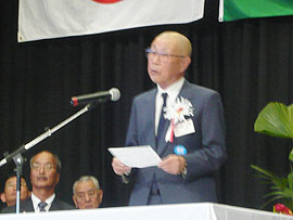 なお、記念式典であいさつした村上空山副団長(協会理事)は「今回の訪問で2組の家族が移住親族と劇的な対面を果たすことができた。対面につながる情報を逐一提供してくれた県人会に心から感謝したい。今回のことで私どもも民間交流の重要さをあらためて確認することができた」と報告。400人で埋まった会場を一層なごやかな雰囲気にしました。